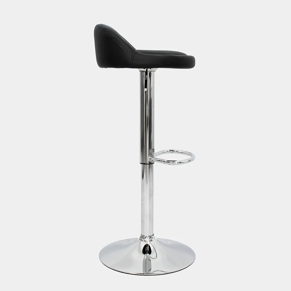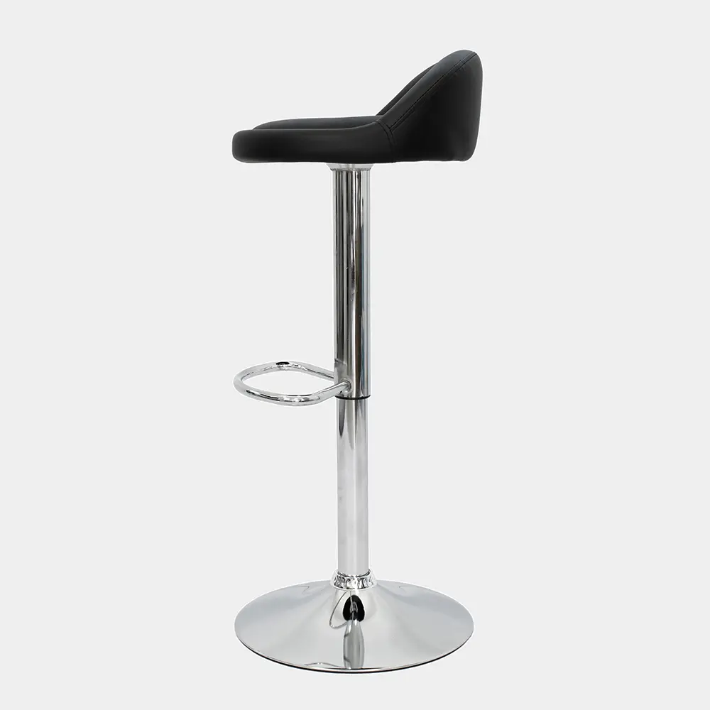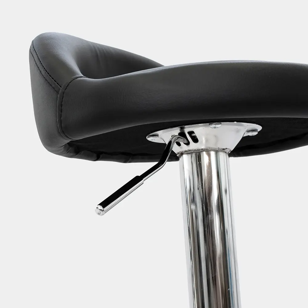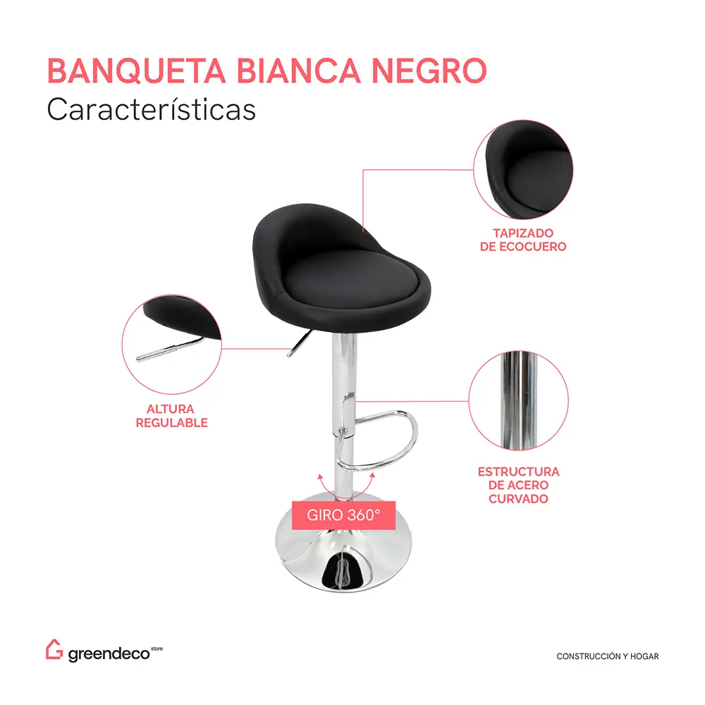 Banqueta de altura regulable con estructura de caño tubular de acero curvado. El asiento está tapizado en eco cuero. El acabado de las patas es cromado. Incluye tornillos y arandelas para armar.