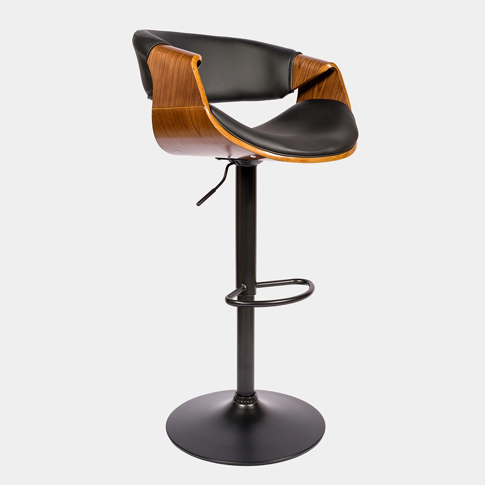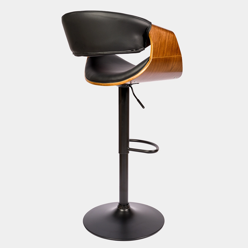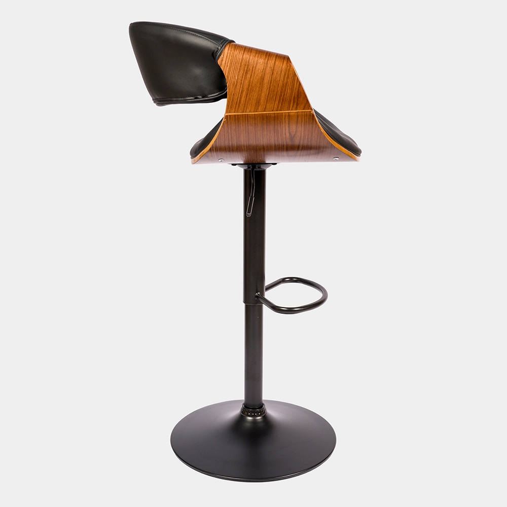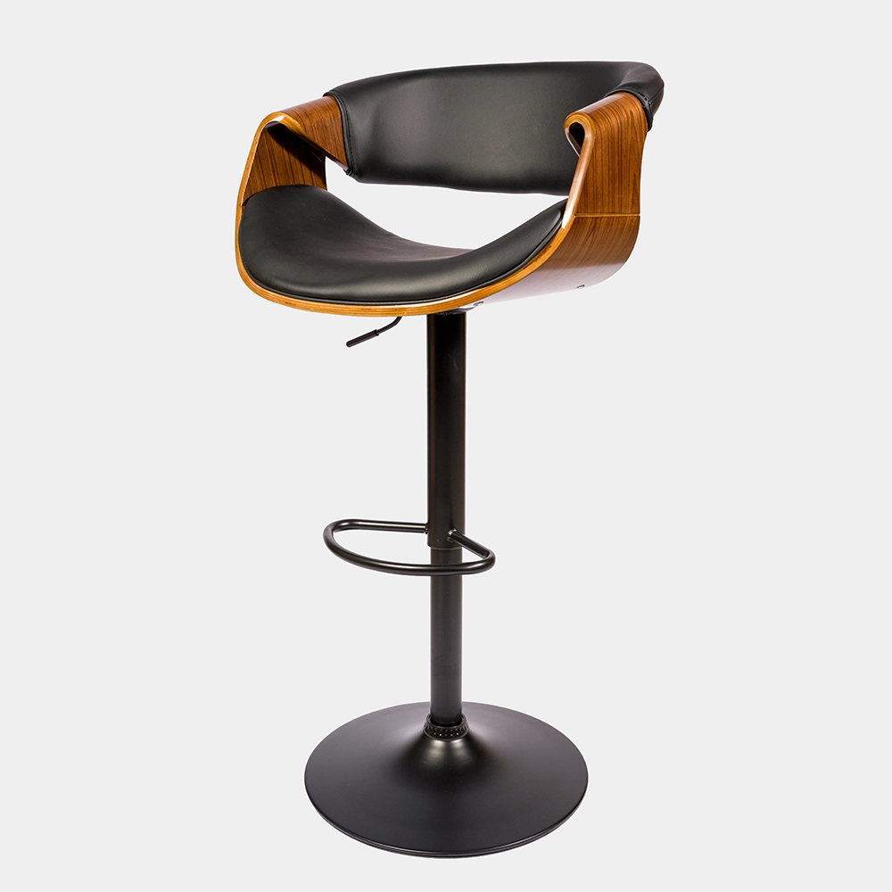 Banqueta de altura regulable con estructura de caño tubular de acero curvado. El asiento está tapizado de eco cuero y madera. El acabado de las patas es cromado. Incluye tornillos y arandelas para armar.