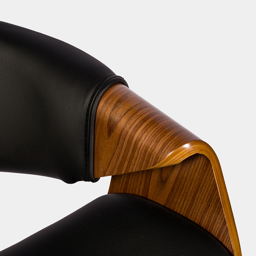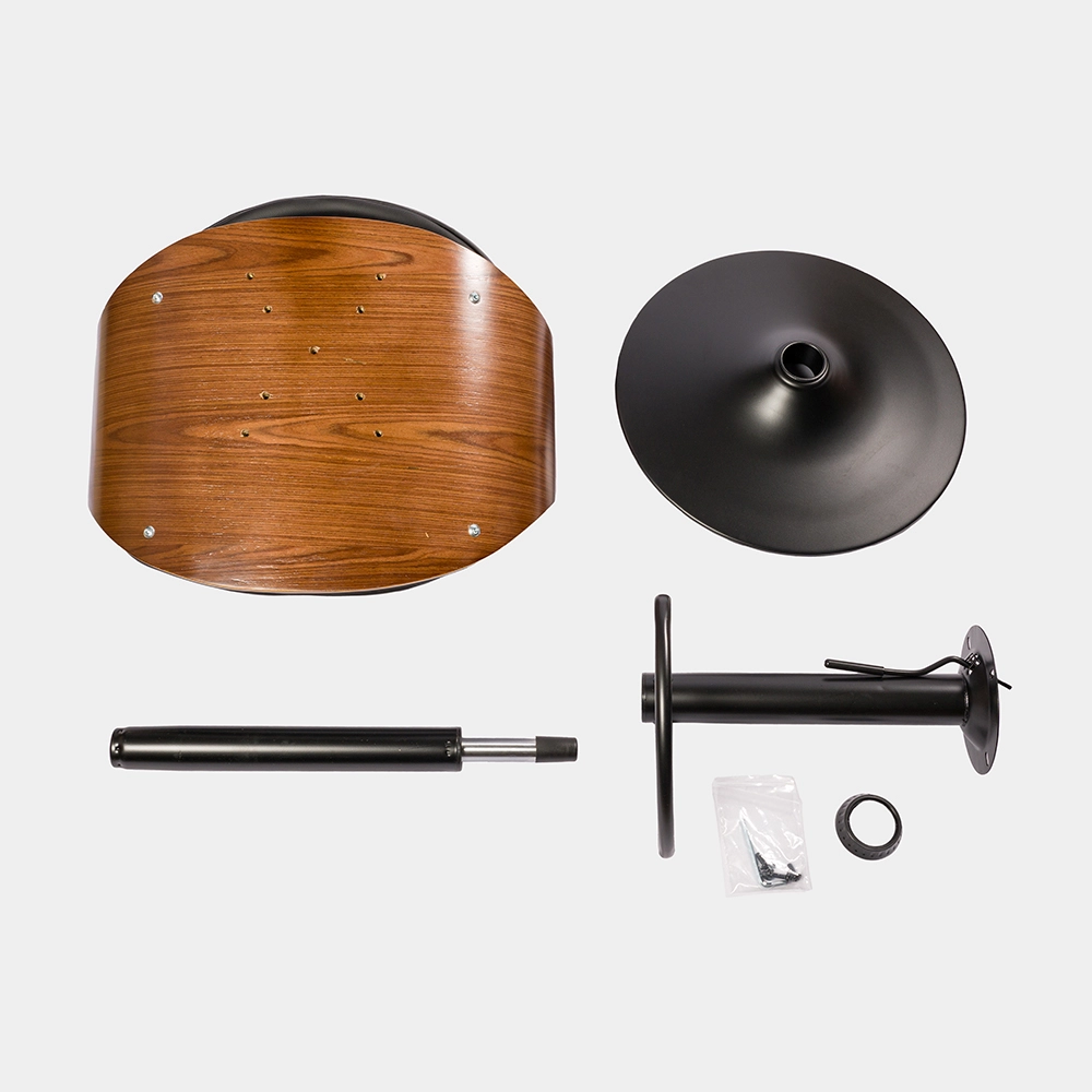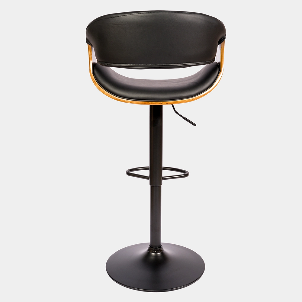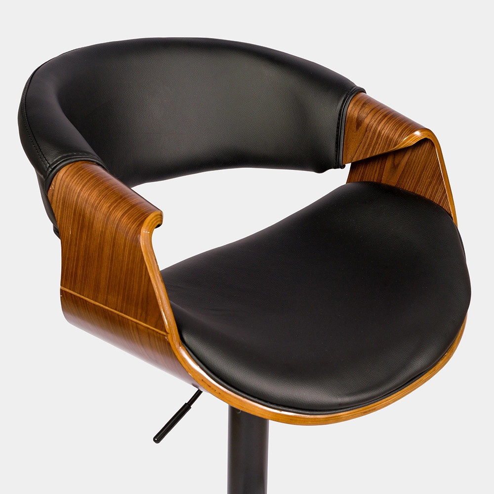 Banqueta de altura regulable con estructura de caño tubular de acero curvado. El asiento está tapizado de eco cuero y madera. El acabado de las patas es cromado. Incluye tornillos y arandelas para armar.