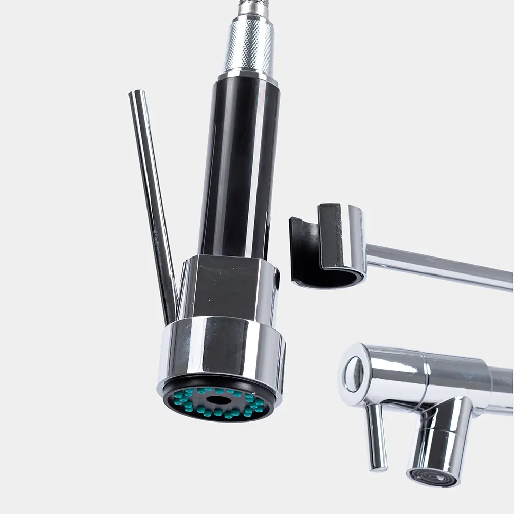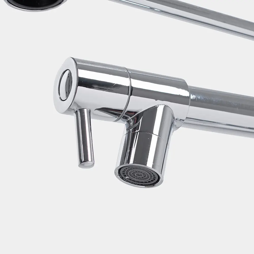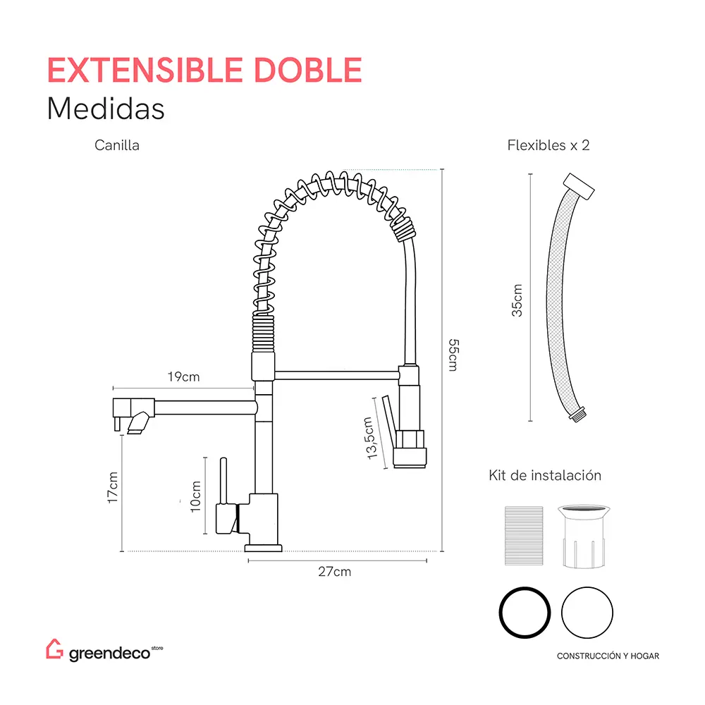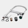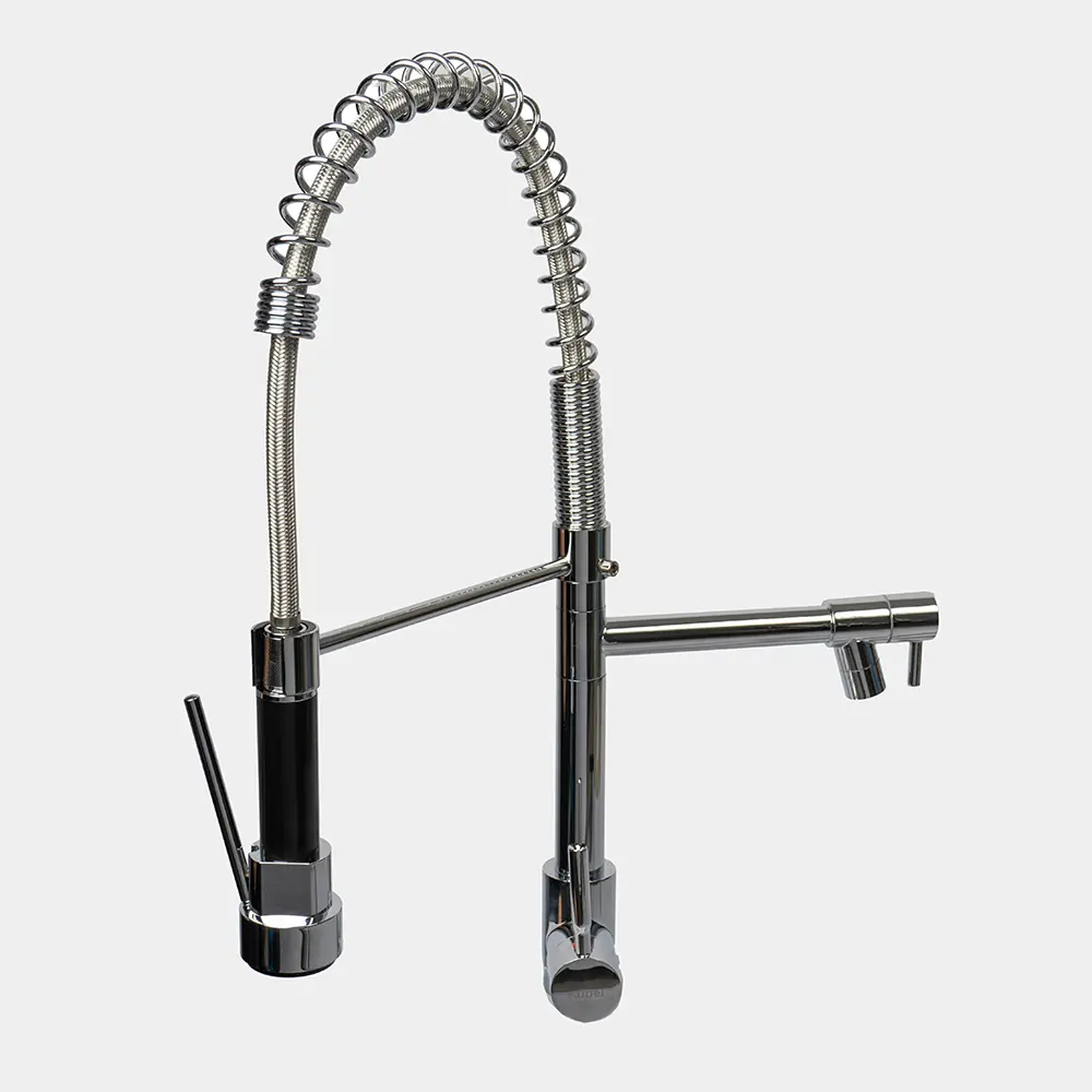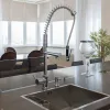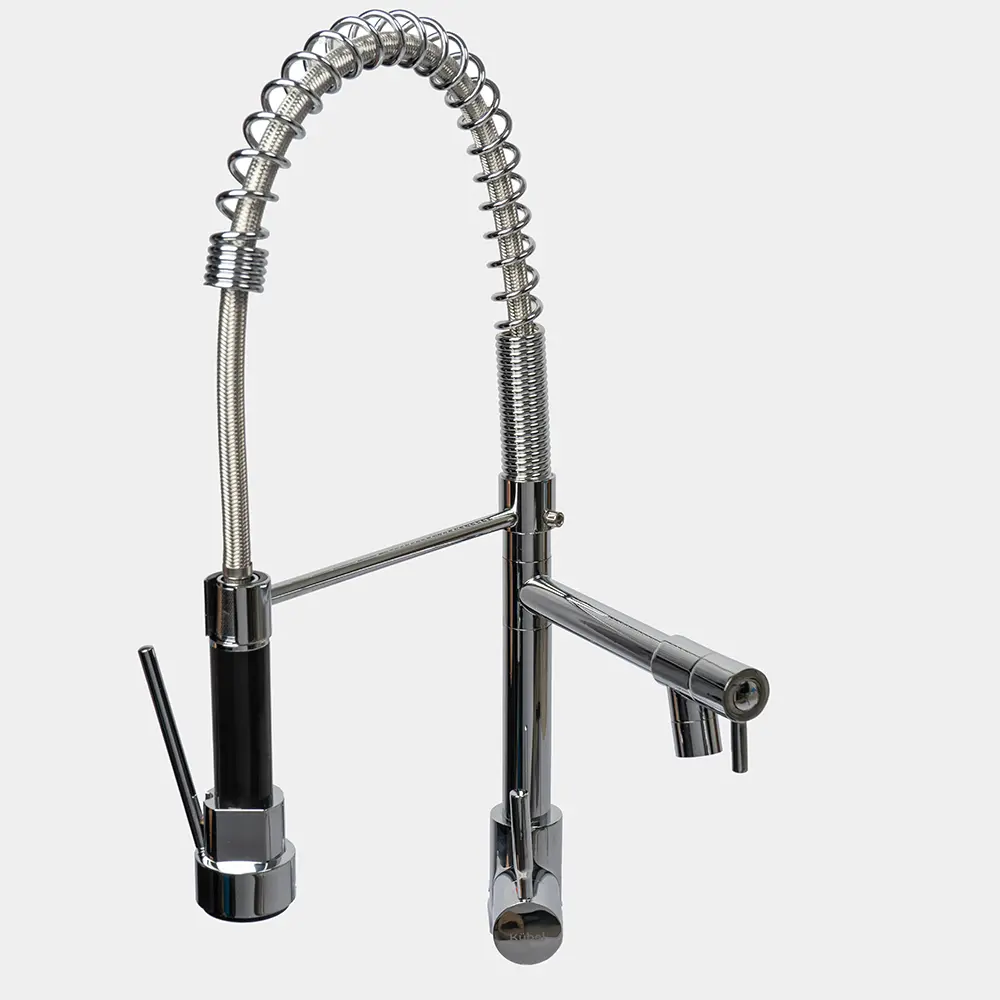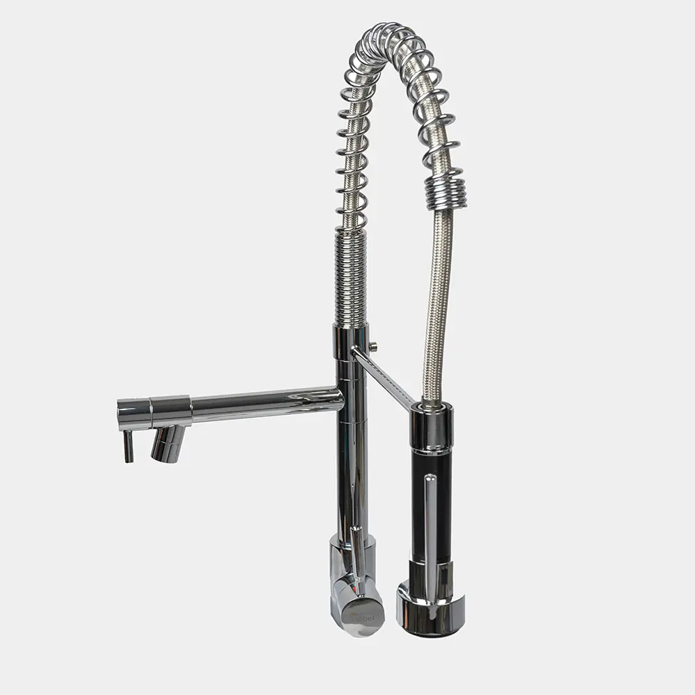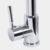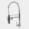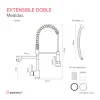 Canilla de acero inoxidable con control monocomando y montaje sobre mesada. Su acabado es de cromo brillante y cuenta con pico aireador anti salpicaduras y rociador.