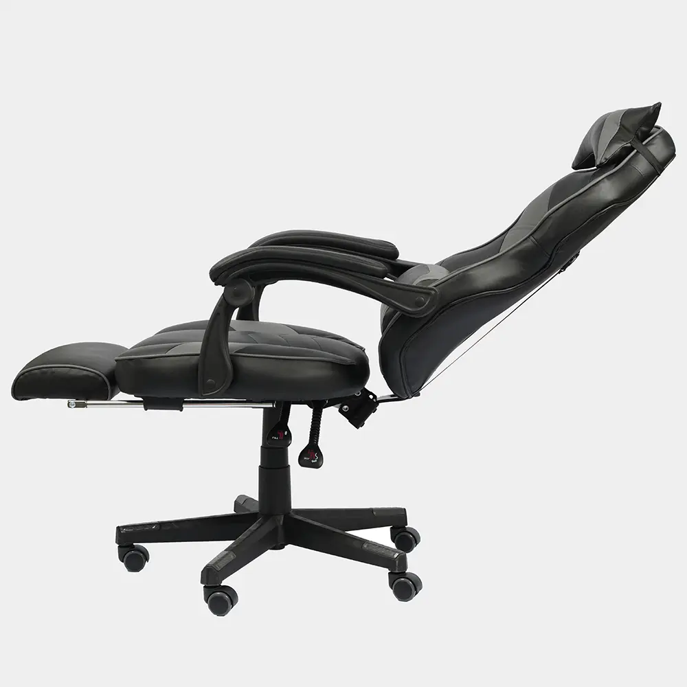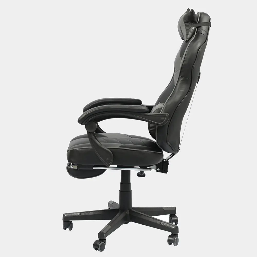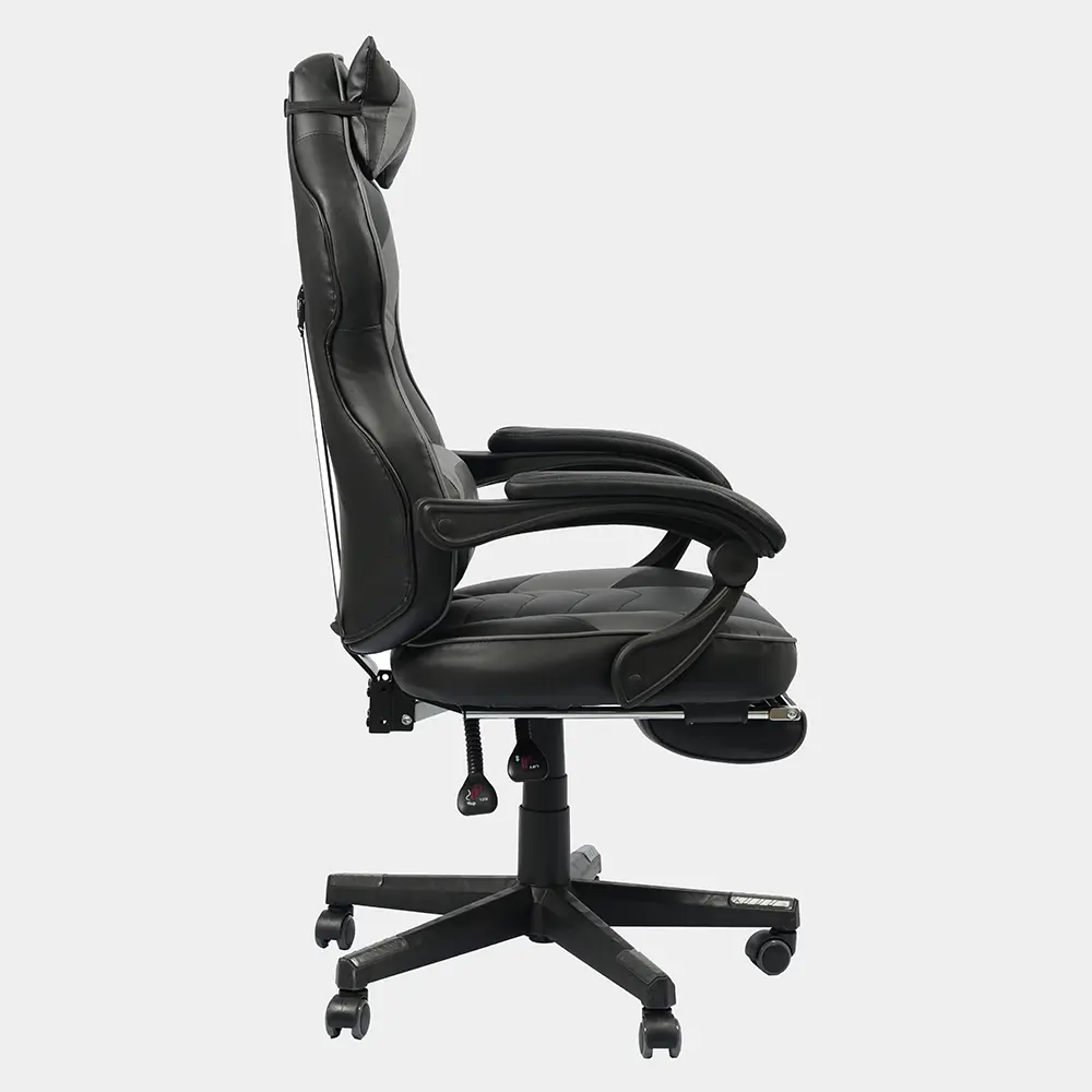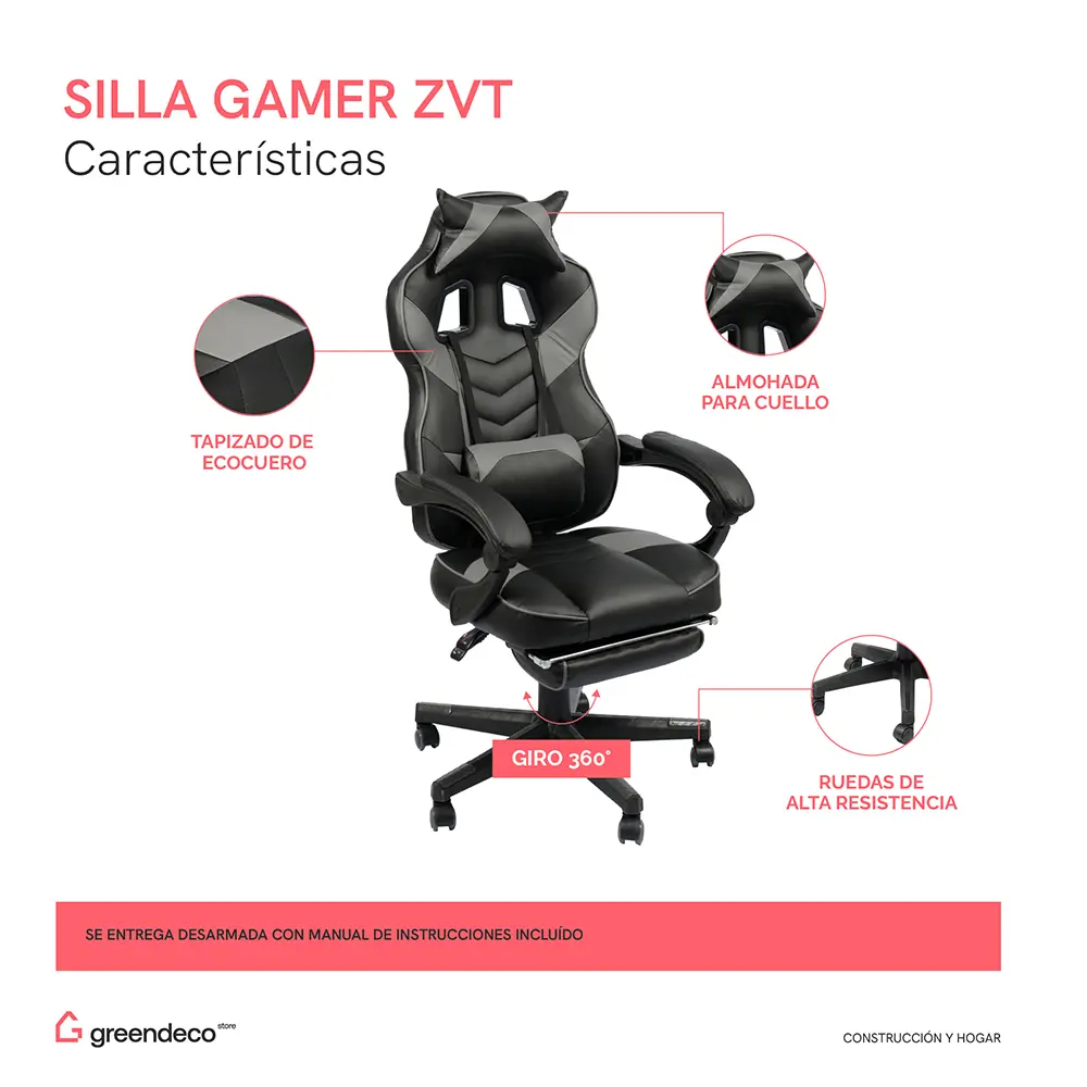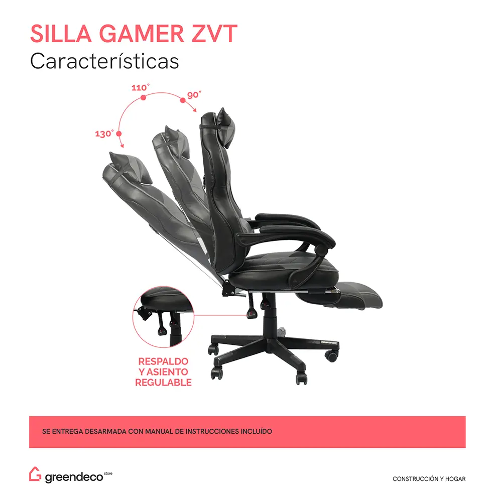 Silla de altura regulable con estructura de caño tubular de acero. El material de la estrella es de PVC. El asiento esta tapizado en eco cuero. Posee almohada para el cuello y la zona lumbar, también posee apoyapiés. Incluye tornillos y arandelas para armar.